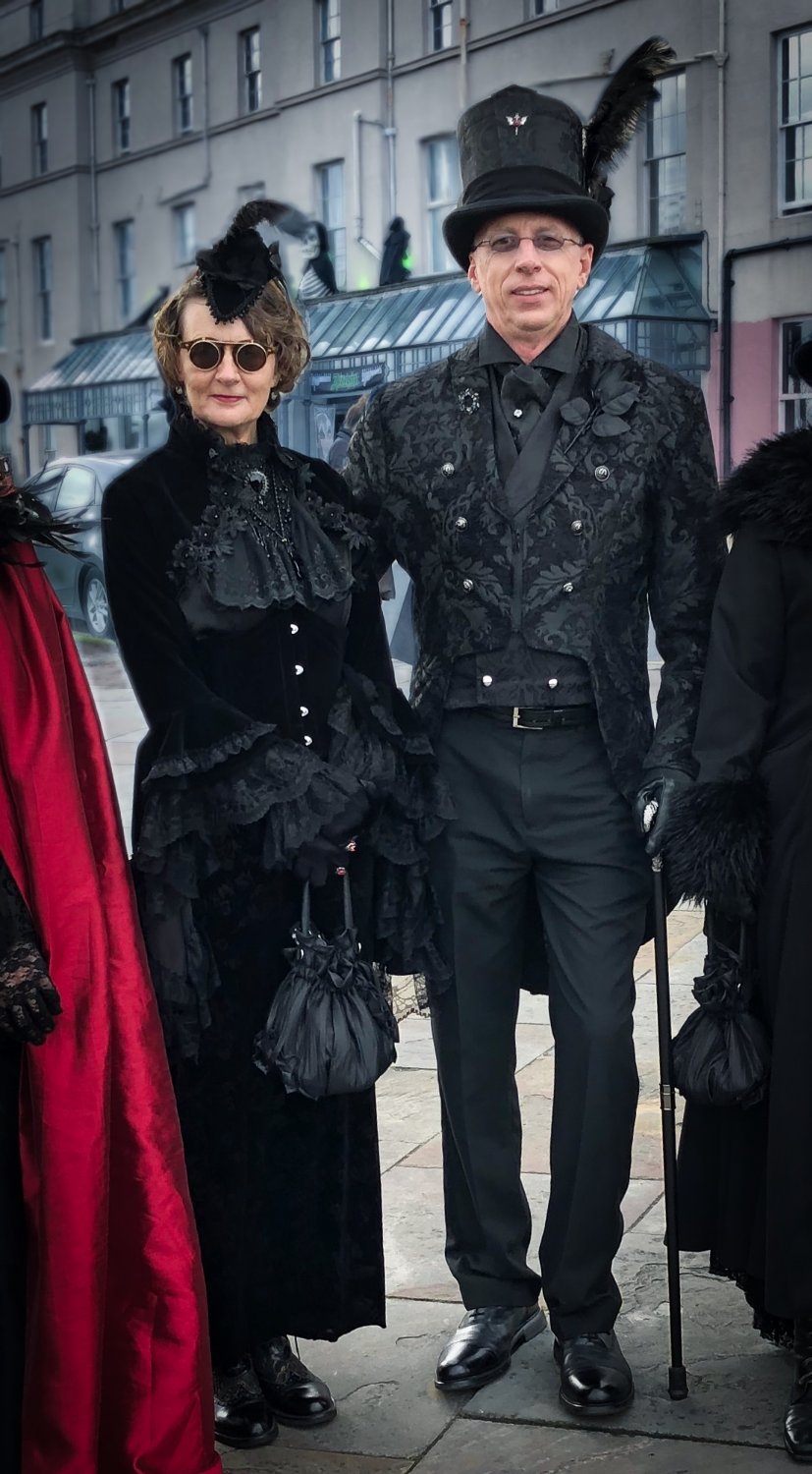 Shown above and at the top of the page are a few 2025 outfits that more-or-less follow the formal side of the early steampunk aesthetic approach. Formal outfits ('attire') and military uniforms tend to be seen more often at modern events than informal or engineer/adventurer/explorer type outfits, but it does rather depend upon the venue. This may be a product of what is readily available 'off the peg' or at the back of the wardrobe, and of course not everyone has the skills, time nor inclination to adopt the 'make it yourself' steampunk ethic complete with homemade leather and brass accessories. However, even with relatively straightforward formal outfits, steampunks still thrive to be creative and expressive, which is at the heart of the steampunk sub-culture.
